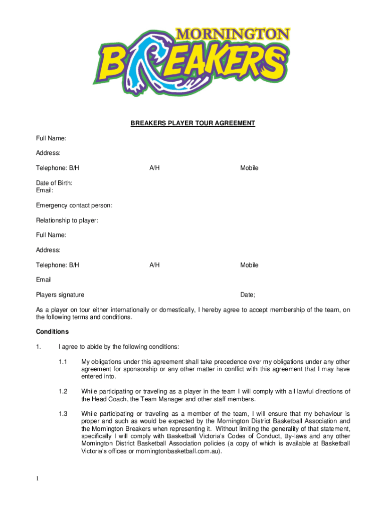 BREAKERS PLAYER TOUR AGREEMENT Full Name: Address: Telephone: B/HA/Mobile/HMobileDate of Birth: Email: Emergency contact person: Relationship to player: Full Name: Address: Telephone: B/H Email Players