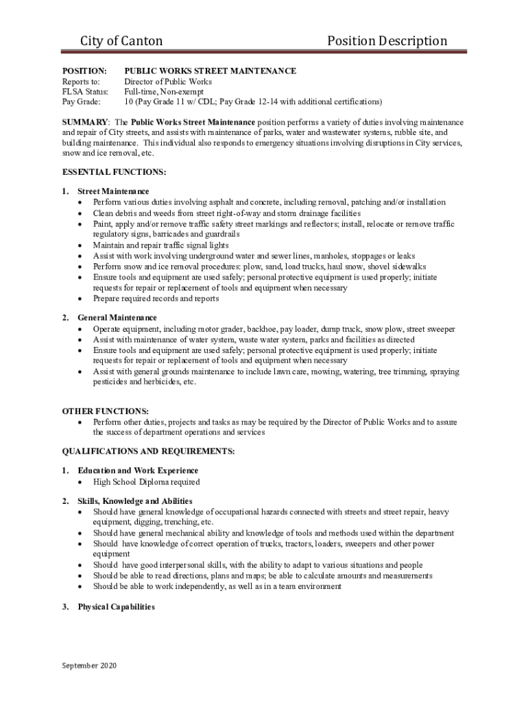 City of Contraposition: Reports to: FLEA Status: Pay Grade:Position DescriptionPUBLIC WORKS STREET MAINTENANCE Director of Public Works Full time, Nonexempt 10 (Pay Grade 11 w/ CDL; Pay Grade 1214
