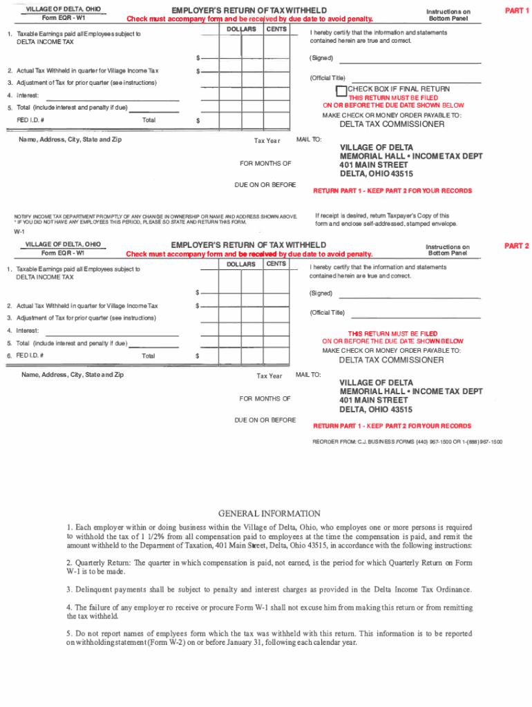 VILLAGE OF DELTA, OHIO Form EQRW1EMPLOYER\'S RETURN OF TAX WITHHELDCheck must accompany form and be received by due date to avoid penalty. DOLLARS1. Taxable Earnings paid all Employees subject to