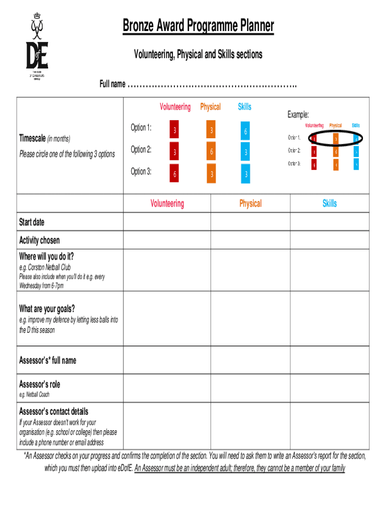 Bronze Award Program Planner Volunteering, Physical and Skills sections Full name. VolunteeringPhysicalSkillsOption 1:336Option 2:363Option 3:633Timescale (in months) Please circle one of the following