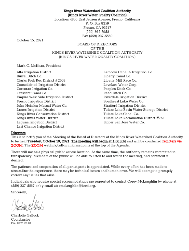October 15, 2021Kings River Watershed Coalition Authority (Kings River Water Quality Coalition) Location: 4886 East Jensen Avenue, Fresno, California P. O. Box 8259 Fresno, CA 93747 (559) 3657958