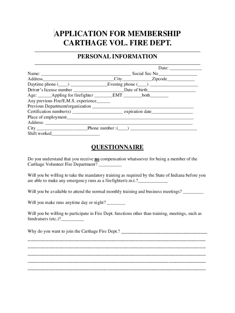 APPLICATION FOR MEMBERSHIP CARTHAGE VOL. FIRE DEPT. ___PERSONAL INFORMATION ___ Date: ___ Name: ___ Social Sec No___ Address___City___Zip code___ Daytime phone (___) ___Evening phone (___) ___ Driver's