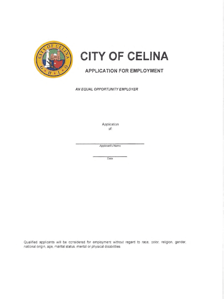 CITY OF CELINA APPLICATION FOR EMPLOYMENT AN EQUAL OPPORTUNITY EMPLOYERApplication of:Applicant\'s NameDateQualified applicants will be considered for employment without regard to race. Color. Religion.