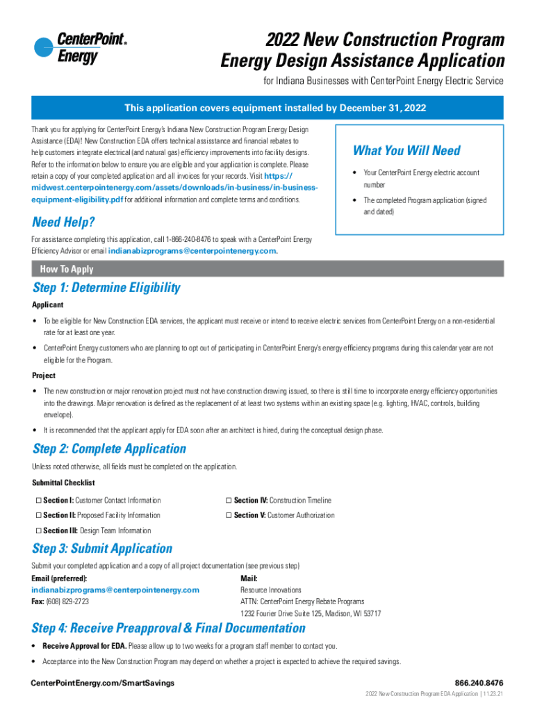 2022 New Construction Program Energy Design Assistance Application for Indiana Businesses with Counterpoint Energy Electric Service This application covers equipment installed by December 31, 2022,