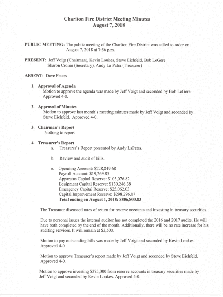 Charlton Fire District Meeting Minutes August 7,2018P U B L I C M E E T I N G : The public meeting of the Charlton Fire District was called to order on August 7, 2018, at 7:56 p.m. PRESENT: Jeff Vogt