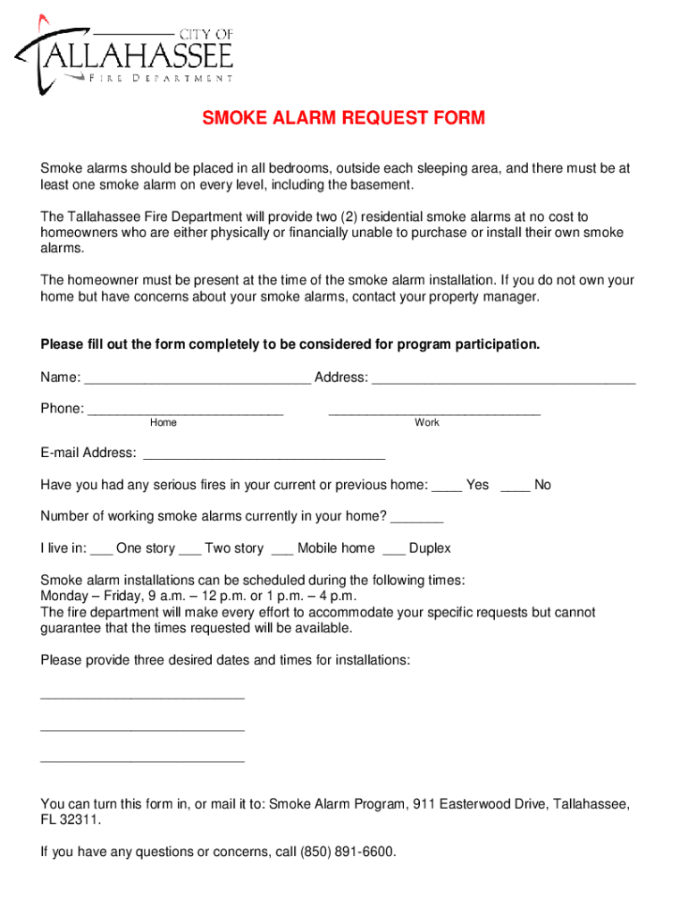 SMOKE ALARM REQUEST FORM Smoke alarms should be placed in all bedrooms, outside each sleeping area, and there must be at least one smoke alarm on every level, including the basement. The Tallahassee