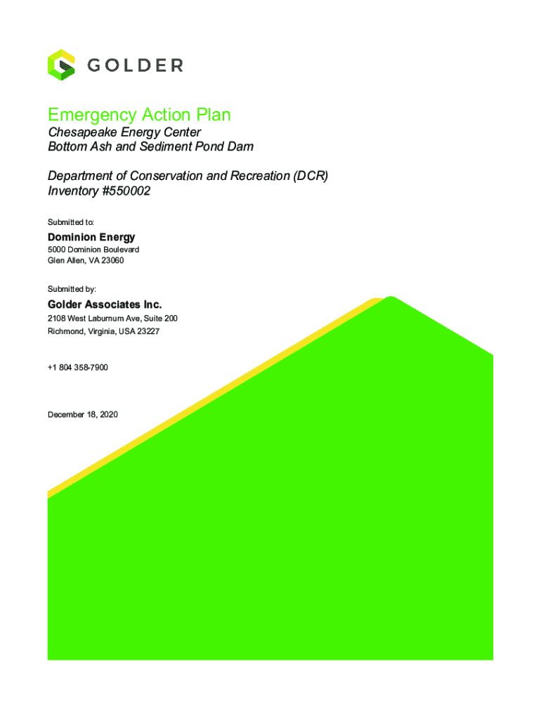 Emergency Action Plan Chesapeake Energy Center Bottom Ash and Sediment Pond Dam Department of Conservation and Recreation (DCR) Inventory #550002 Submitted to:Dominion Energy5000 Dominion Boulevard