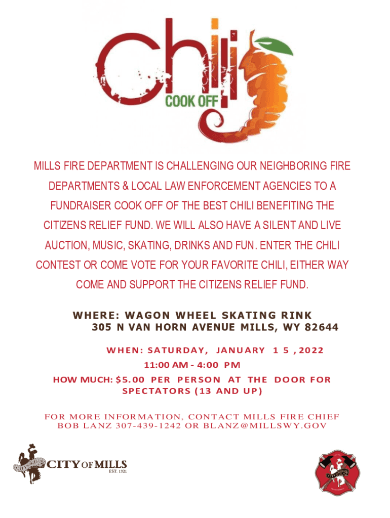 MILLS FIRE DEPARTMENT IS CHALLENGING OUR NEIGHBORING FIRE DEPARTMENTS & LOCAL LAW ENFORCEMENT AGENCIES TO A FUNDRAISER COOK OFF OF THE BEST CHILI BENEFITING THE CITIZENS RELIEF FUND. WE WILL ALSO