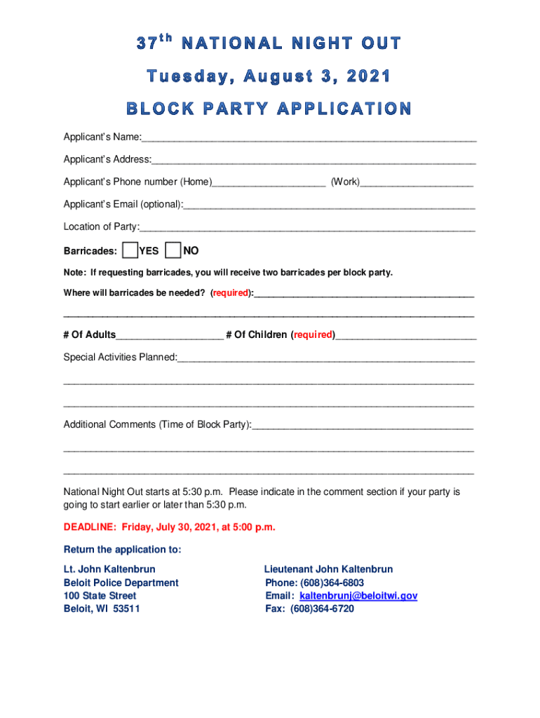 WI PD Block Party Application - City of Beloit 2021 free printable template