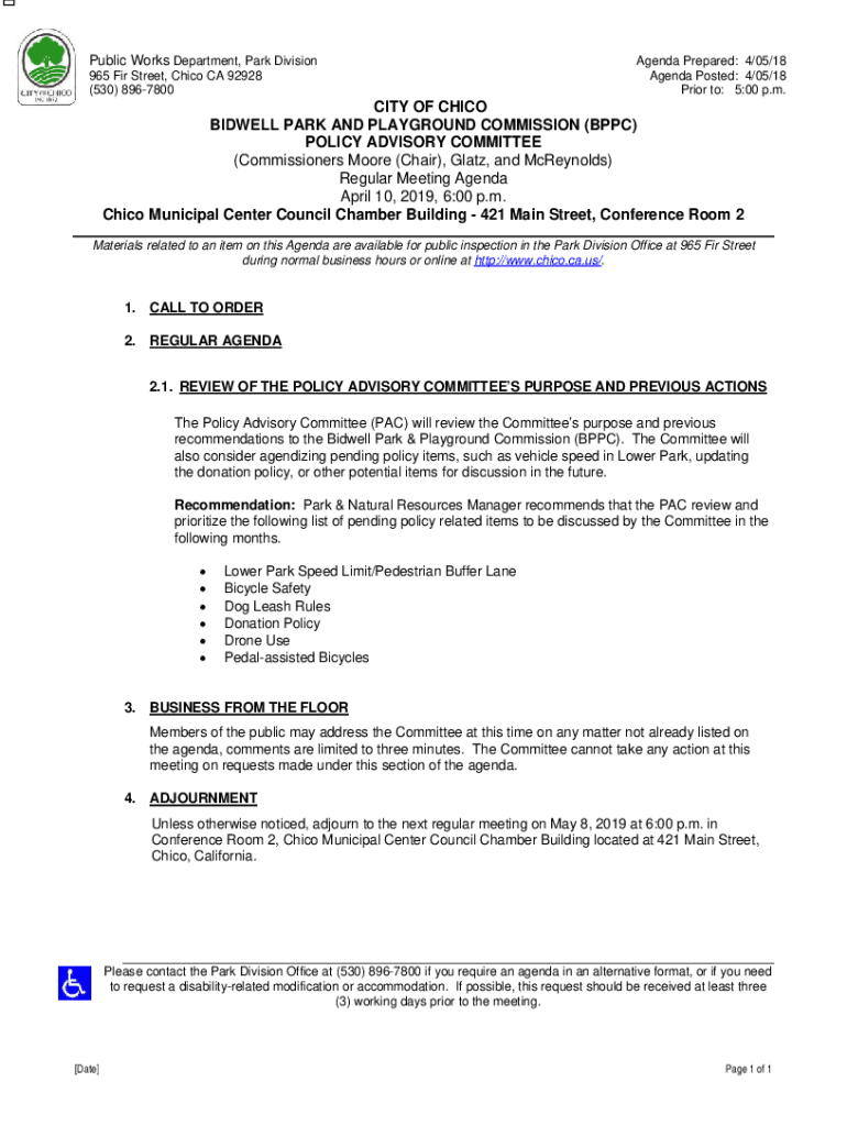 Public Works Department, Park Division 965 Fir Street, Chico CA 92928 (530) 8967800Agenda Prepared: 4/05/18 Agenda Posted: 4/05/18 Prior to: 5:00 p.m.CITY OF CHICO DWELL PARK AND PLAYGROUND COMMISSION