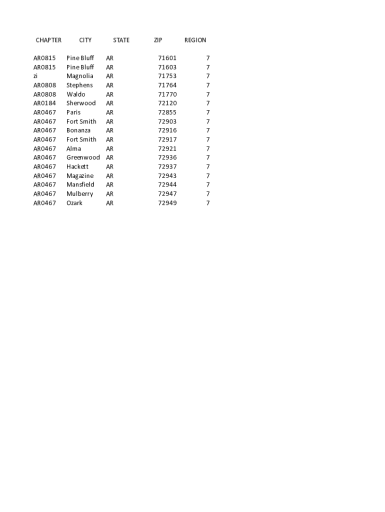 CHAPTER AR0815 ZI AR0808 AR0184 AR0467 AR0467 AR0467 AR0467 AR0467 AR0467 AR0467 AR0467 AR0467 AR0467 AR0467CITY Pine Bluff Magnolia Stephens Waldo Sherwood Paris Fort Smith Bonanza Fort Smith Alma