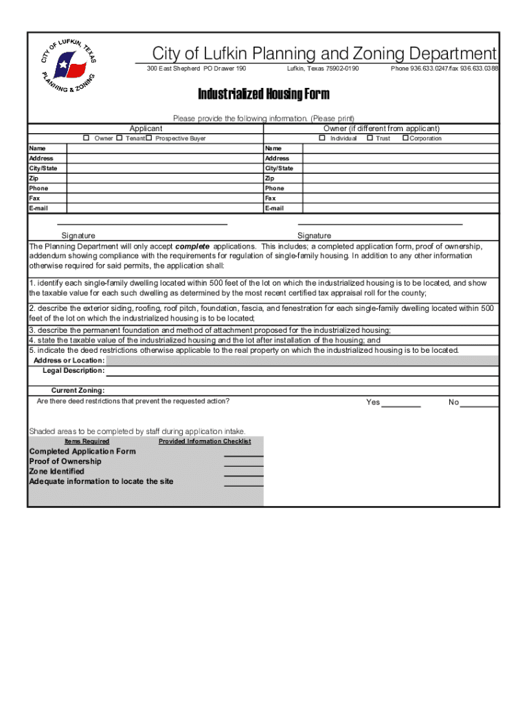 City of Ruskin Planning and Zoning Department 300 East Shepherd PO Drawer 190Lufkin, Texas 759020190Phone 936.633.0247/fax 936.633.0388Industrialized Housing Form Applicant OwnerTenantPlease provide