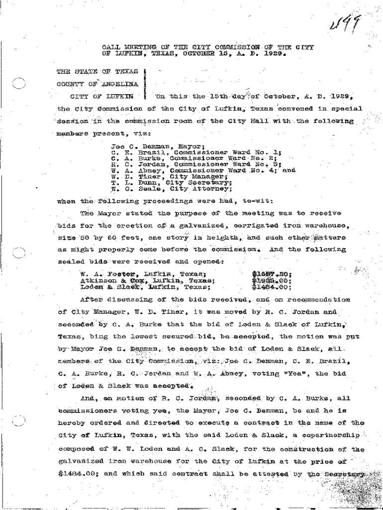 4/ CALL. 1TING OF T CITY COIsi1MJSSIO.other OP Lumpkin, TEXAS, OCTOBER 15, A. 1). 1929, The STATE OF TEXAS.COIThTTY OF ANGELINA...CITY OF Luckily This.the.l5thdajoi1 October, A. D. 19Z9,the City Commission