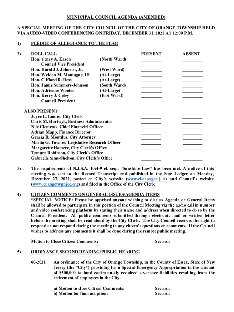 MUNICIPAL COUNCIL AGENDA (AMENDED) A SPECIAL MEETING OF THE CITY COUNCIL OF THE CITY OF ORANGE TOWNSHIP HELD VIA AUDIOVIDEO CONFERENCING ON FRIDAY, DECEMBER 31, 2021, AT 12:00 P.M. 1)PLEDGE OF ALLEGIANCE