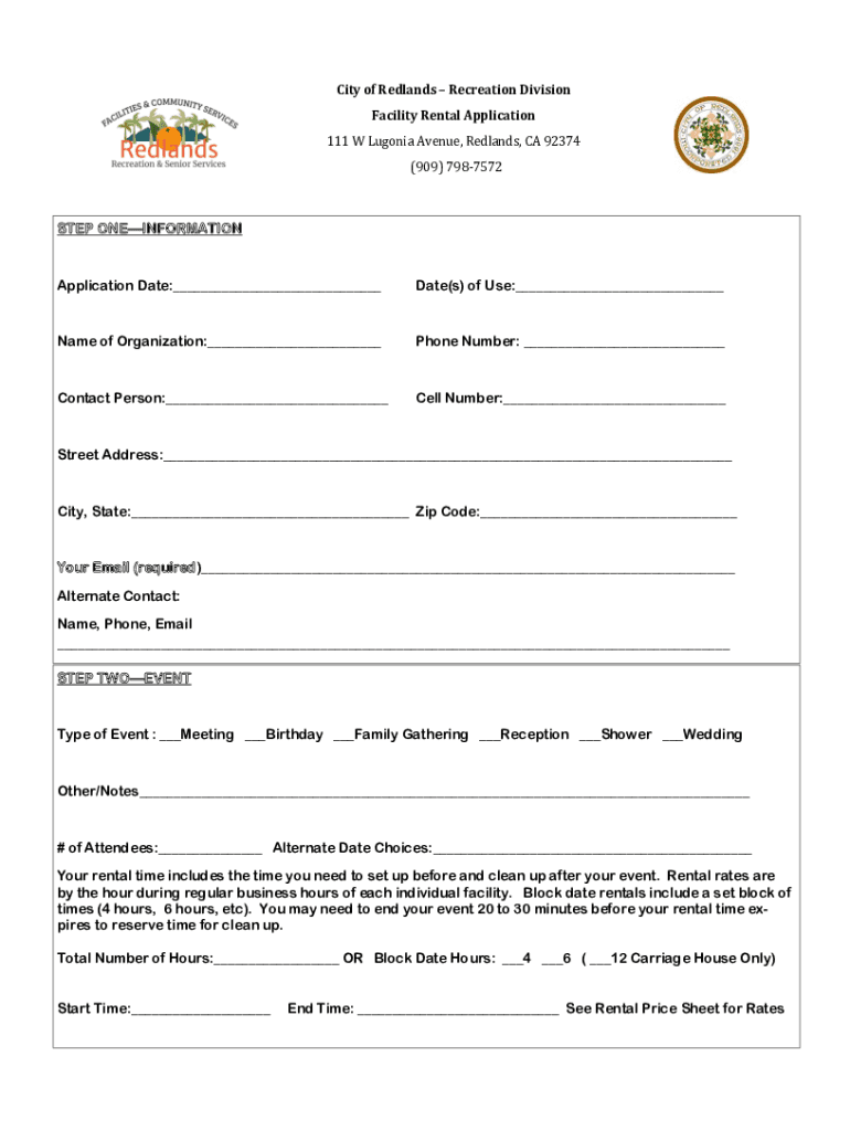 City of Redlands Recreation Division Facility Rental Application 111 W Eugenia Avenue, Redlands, CA 92374 (909) 7987572STEP ONEINFORMATIONApplication Date:___Date(s) of Use:___Name of Organization:___Phone