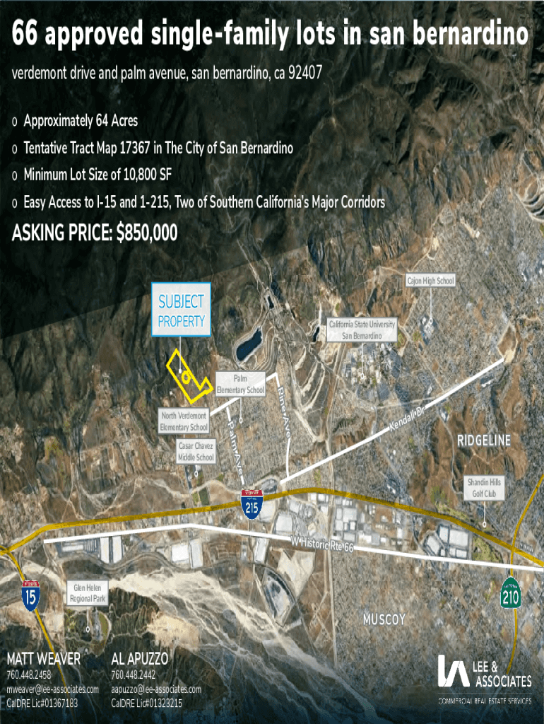 66 approved single family lots in San Bernardino Vermont drive and palm avenue, San Bernardino, ca 92407 approximately 64 Acres tentative Tract Map 17367 in The City of San Bernardino minimum Lot