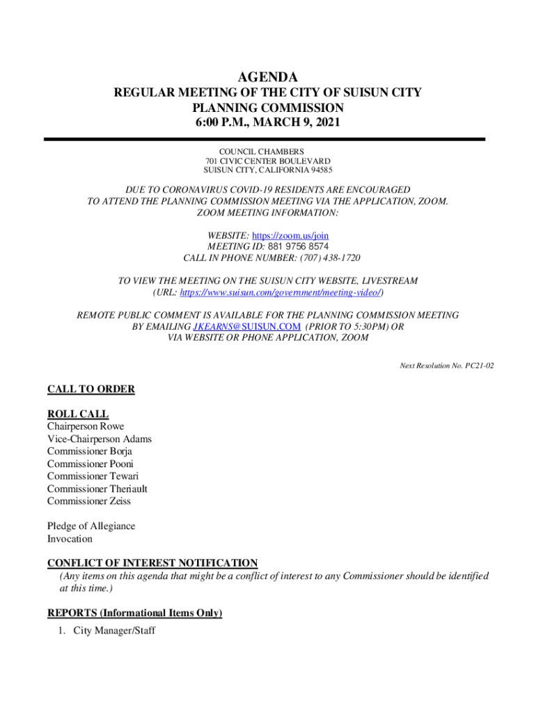 AGENDA REGULAR MEETING OF THE CITY OF SUSAN CITY PLANNING COMMISSION 6:00 P.M., MARCH 9, 2021, COUNCIL CHAMBERS 701 CIVIC CENTER BOULEVARD SUSAN CITY, CALIFORNIA 94585DUE TO CORONAVIRUS COVID-19 RESIDENTS