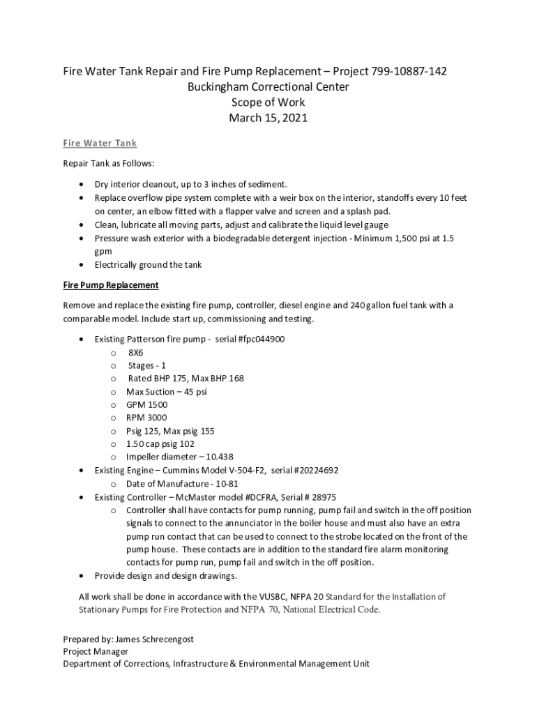 Fire Water Tank Repair and Fire Pump Replacement Project 79910887142 Buckingham Correctional Center Scope of Work March 15, 2021, Fire Water Tank Repair Tank as Follows: Dry interior clean out, up
