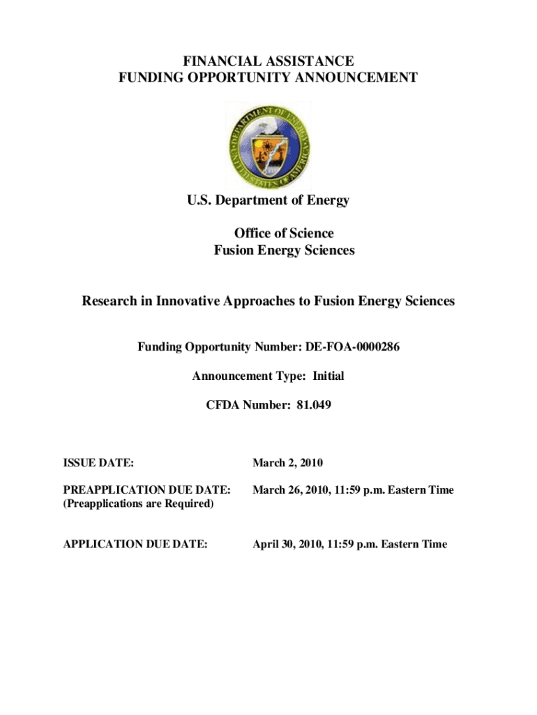 FINANCIAL ASSISTANCE FUNDING OPPORTUNITY ANNOUNCEMENT. S. Department of Energy Office of Science Fusion Energy SciencesResearch in Innovative Approaches to Fusion Energy Sciences Funding Opportunity