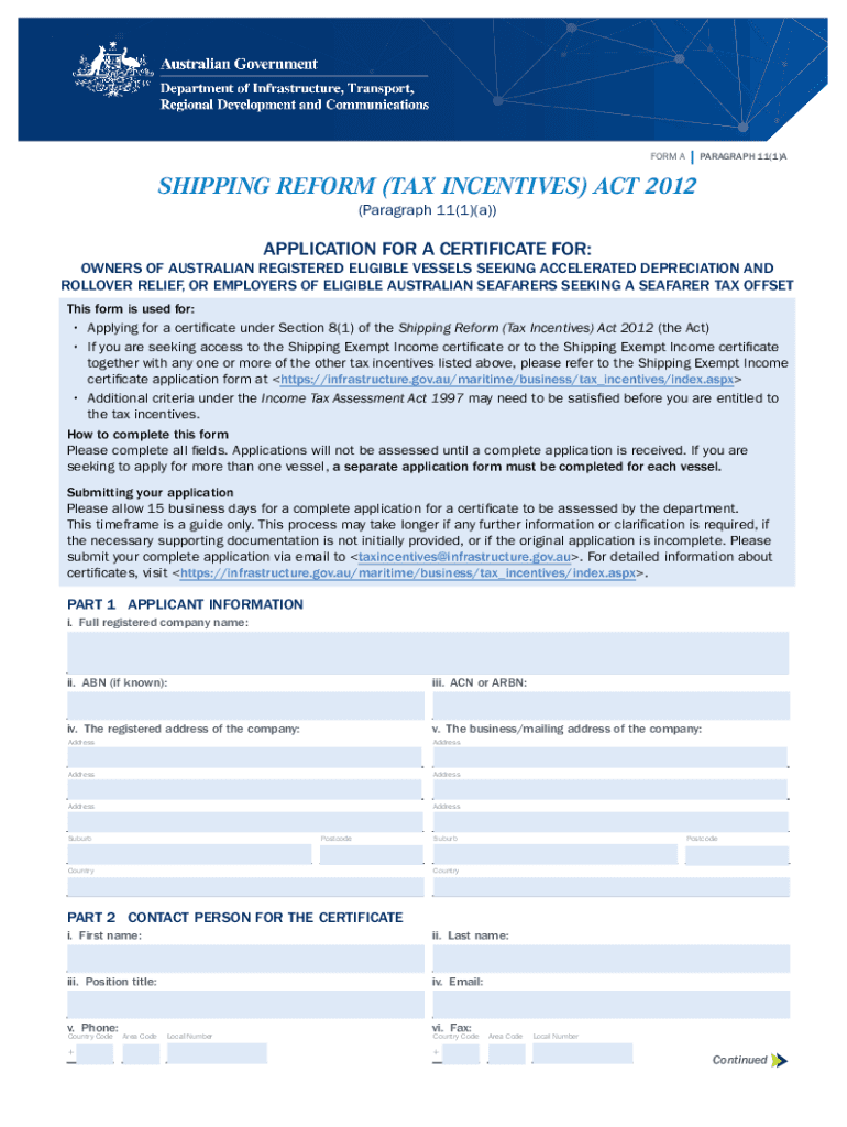 FORM A | PARAGRAPH 11(1)SHIPPING REFORM (TAX INCENTIVES) ACT 2012 (Paragraph 11(1)(a))APPLICATION FOR A CERTIFICATE FOR:OWNERS OF AUSTRALIAN REGISTERED ELIGIBLE VESSELS SEEKING ACCELERATED DEPRECIATION