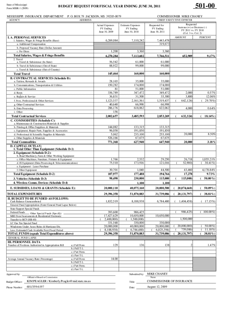 State of Mississippi Form MBR1 (2009)50100BUDGET REQUEST FOR FISCAL YEAR ENDING JUNE 30, 2011MISSISSIPPI INSURANCE DEPARTMENT. O. BOX 79 JACKSON, MS 392050079AGENCYCOMMISSIONER MIKE CHANEYADDRESSCHIEF