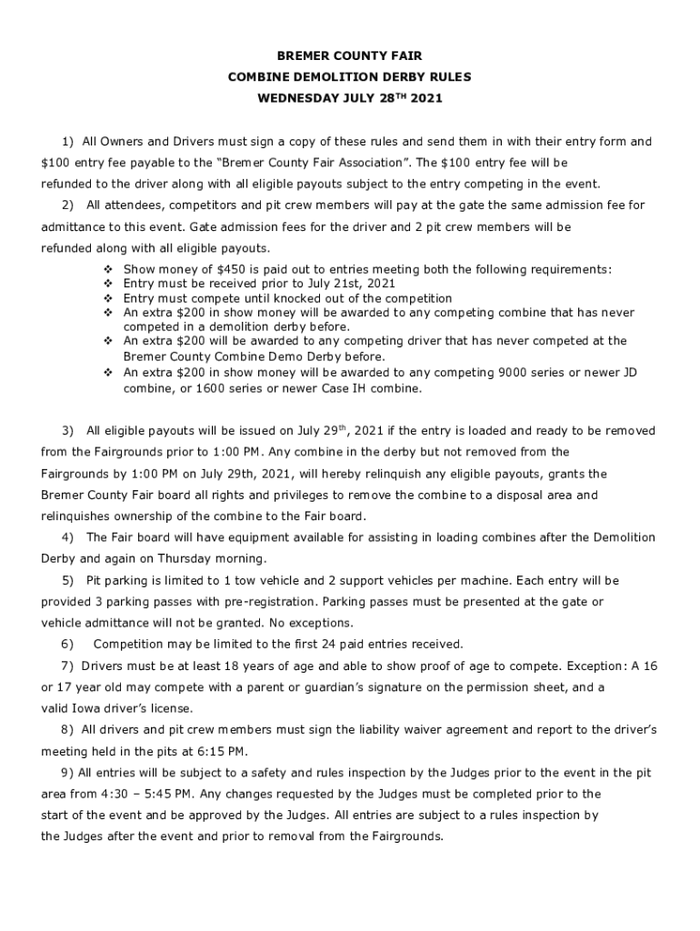 BREMEN COUNTY FAIR COMBINE DEMOLITION DERBY RULES WEDNESDAY, JULY 28TH 2021 1) All Owners and Drivers must sign a copy of these rules and send them in with their entry form and $100 entry fee payable