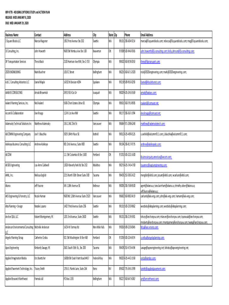 RFP #770 HOUSING OPTIONS STUDY and ACTION PLAN RELEASE: WED JANUARY 8, 2020, DUE: WED JANUARY 29, 2020Business NameContactAddressCityState Zip3 Square Blocks LLC Marcia Wagoner1932 First Avenue Ste