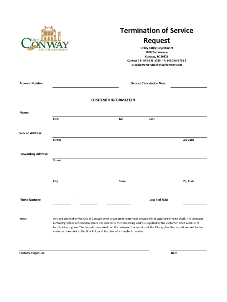 Termination of Service Request Utility Billing Department 1000 2nd Avenue Conway, SC 29526 Contact | P: 8432481780 × F: 8432481718 × E: customer service×cityofconway.account Number:Service Cancellation