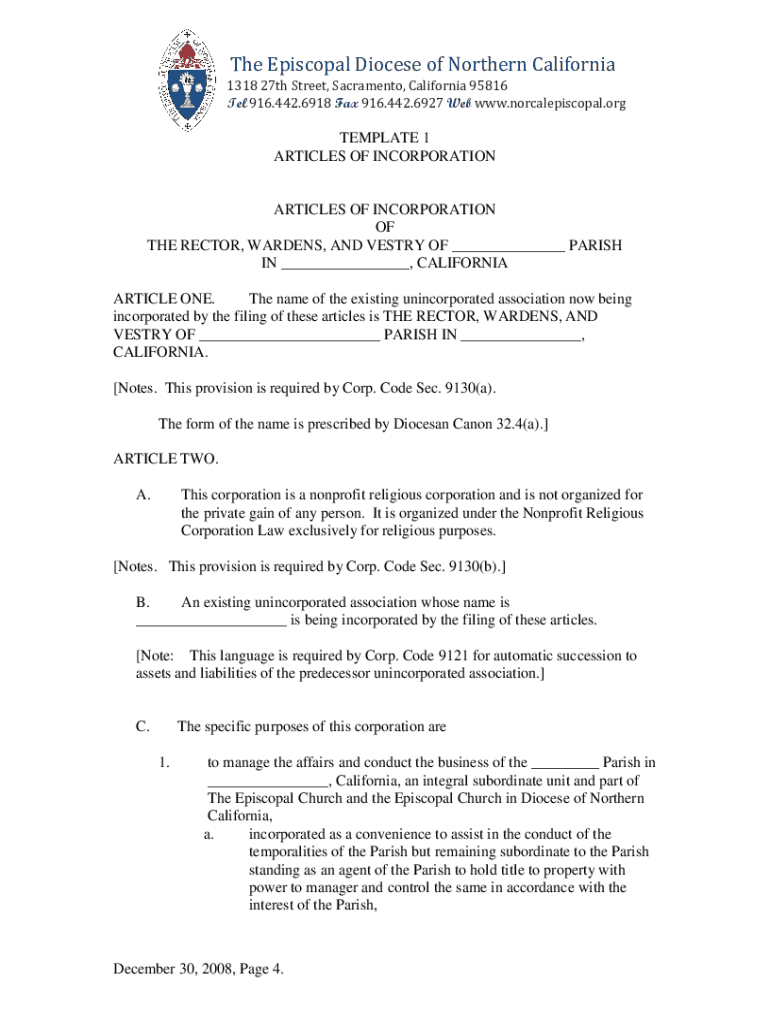 The Episcopal Diocese of Northern California1318 27th Street, Sacramento, California 95816 Tel 916.442.6918 Fax 916.442.6927 Web www.norcalepiscopal.orgTEMPLATE 1 ARTICLES OF INCORPORATIONARTICLES