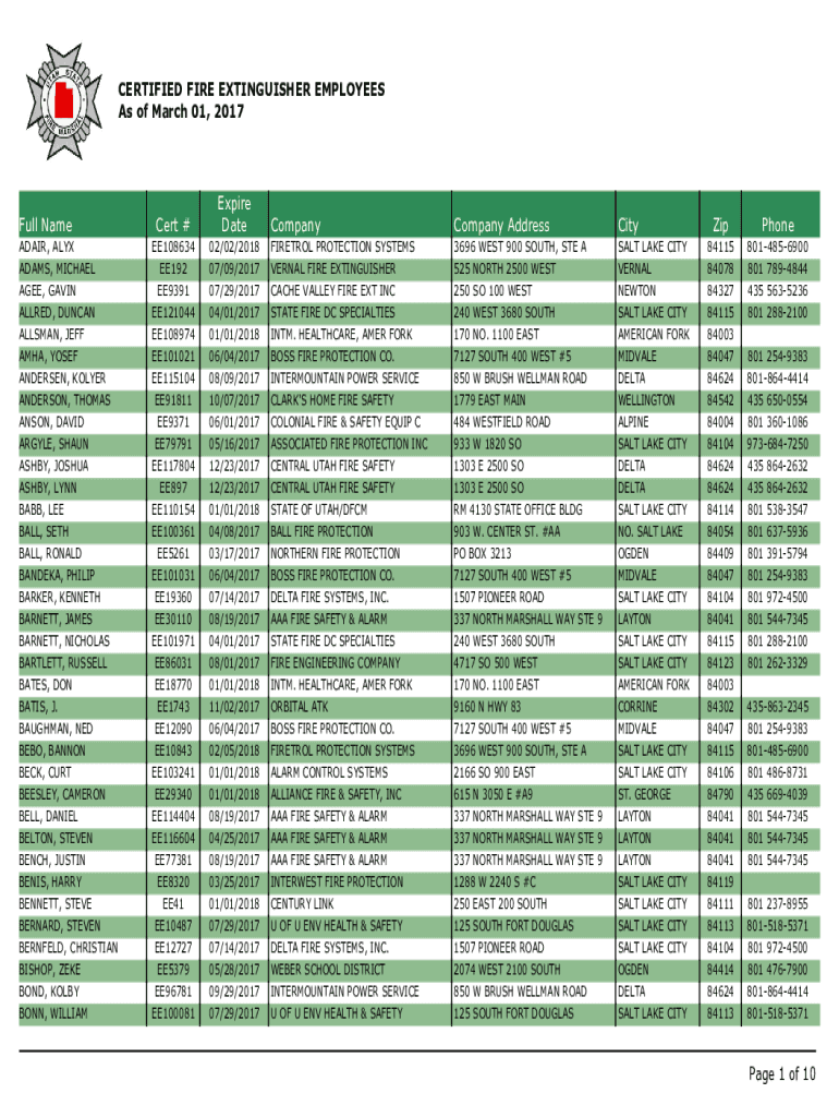 CERTIFIED FIRE EXTINGUISHER EMPLOYEES As of March 01, 2017Full Name ADAR, ALEX ADAMS, MICHAELA GEE, GAVIN ALLIED, DUNCAN ALLAN, JEFF AMHA, YOSEF ANDERSEN, OLDER ANDERSON, THOMAS ANSON, DAVID ARGYLE,