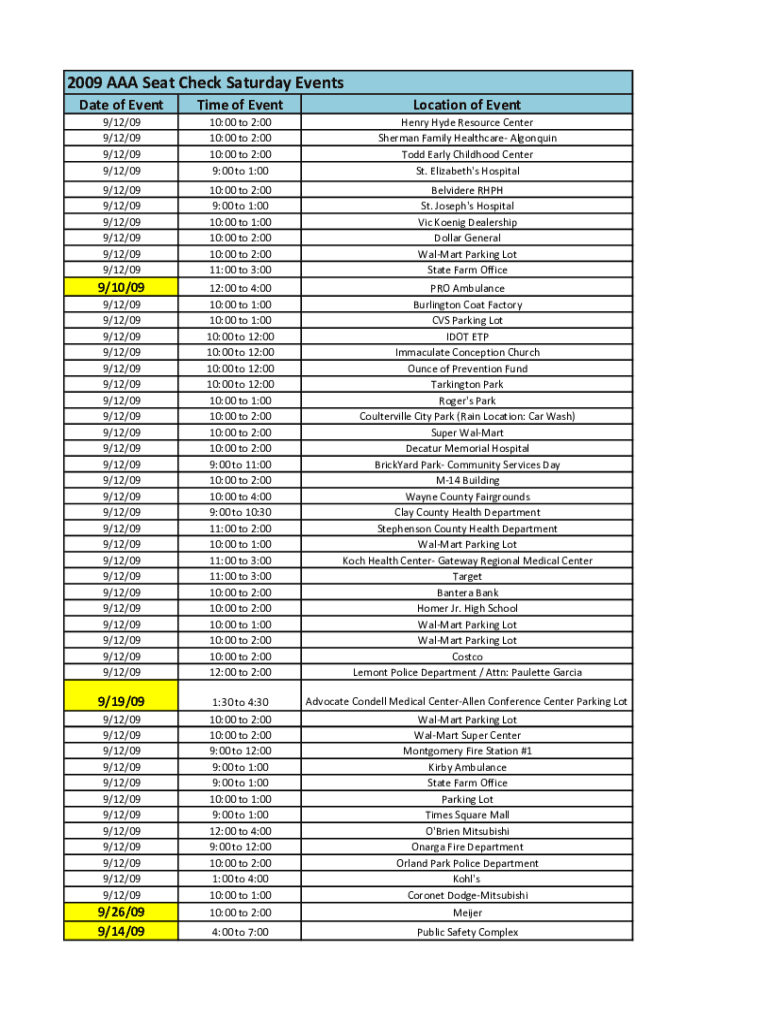 2009 AAA Seat Check Saturday Events Date of Eventide of EventLocation of Event9/12/09 9/12/09 9/12/09 9/12/0910:00 to 2:00 10:00 to 2:00 10:00 to 2:00 9:00 to 1:00Henry Hyde Resource Center Sherman