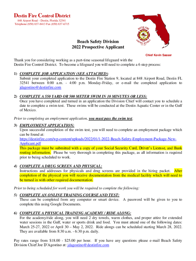 Destiny Fire Control District 848 Airport Road Destiny, Florida 32541 Telephone (850) 8378413 Fax (850) 8376715Beach Safety Division 2022 Prospective Applicant Chief Kevin SasserThank you for considering