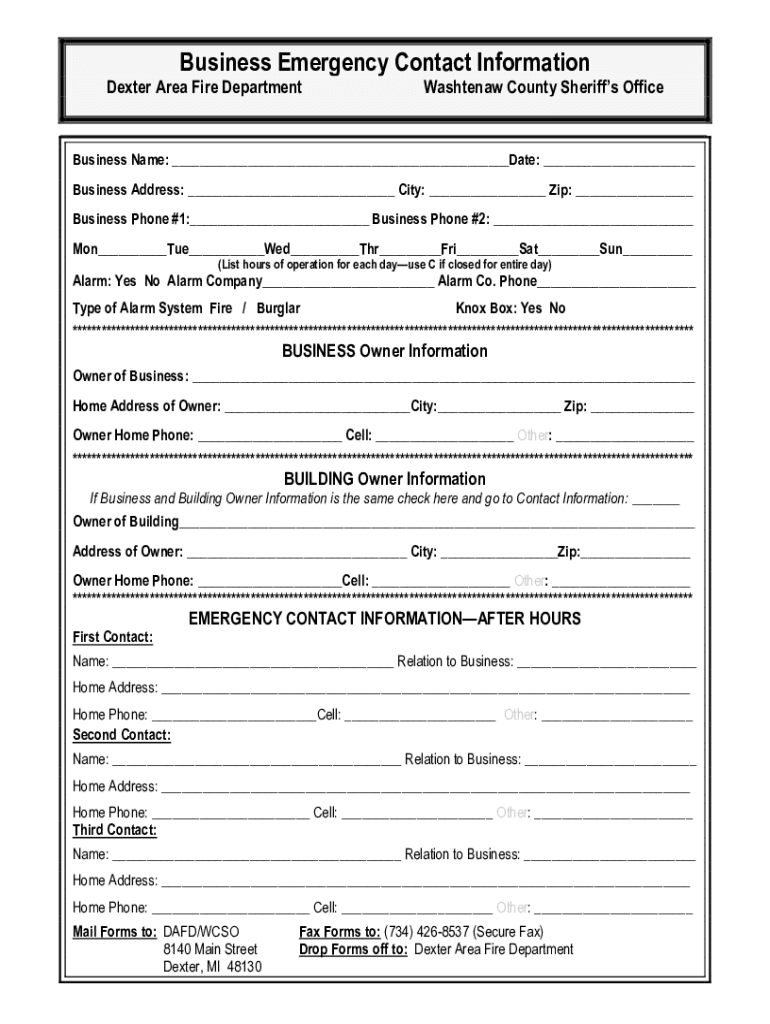 Business Emergency Contact Information Dexter Area Fire DepartmentWashtenaw County Sheriffs Officiousness Name: ___Date: ___ Business Address: ___ City: ___ Zip: ___ Business Phone #1:___ Business