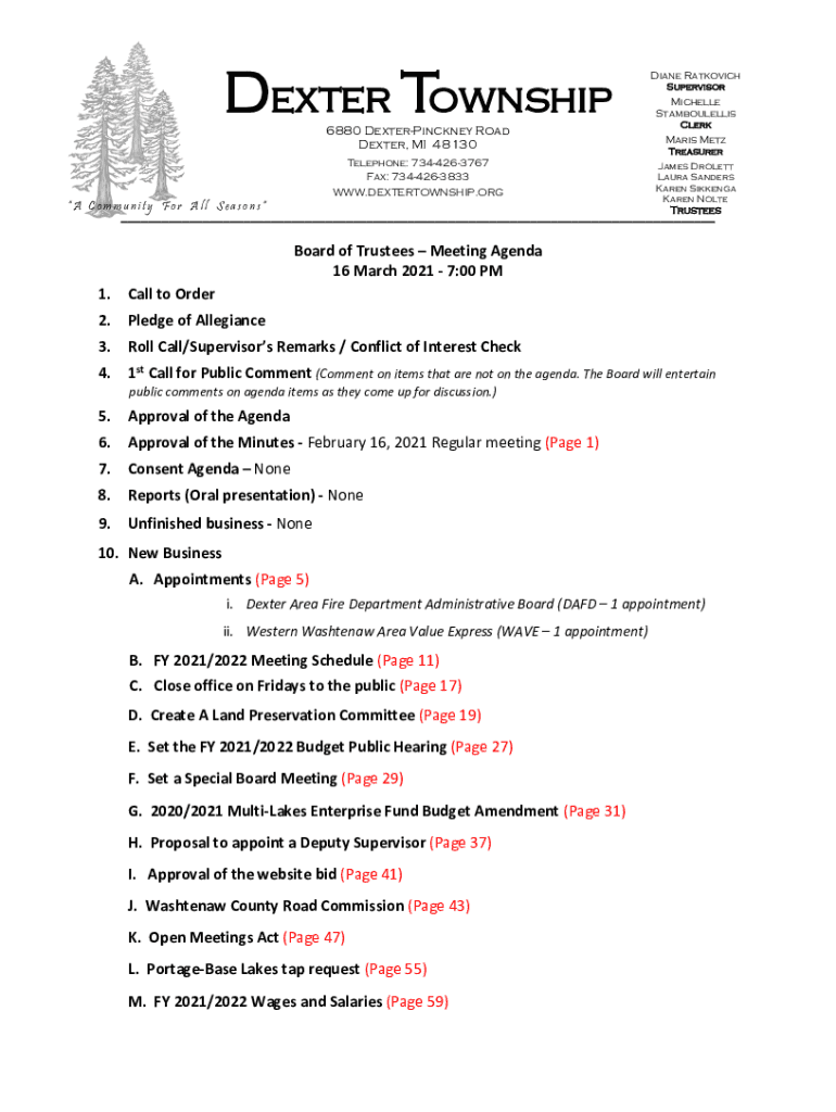 Dexter Township 6880 Dexter Pinckney Road Dexter, MI 48130 Telephone: 7344263767 Fax: 7344263833 WWW.DEXTERTOWNSHIP.ORGAN Community For All Seasons Diane Makovich Supervisor Michelle Stamboulellis