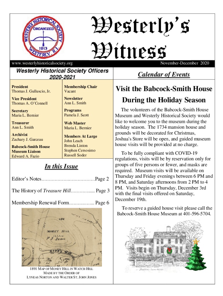 WWW.westerlyhistoricalsociety.westerly Historical Society Officers 20202021 President Thomas J. Gallucci, Jr. Membership Chair VacantVice President Thomas A. OConnellNewsletter Ann L. Smith Secretary