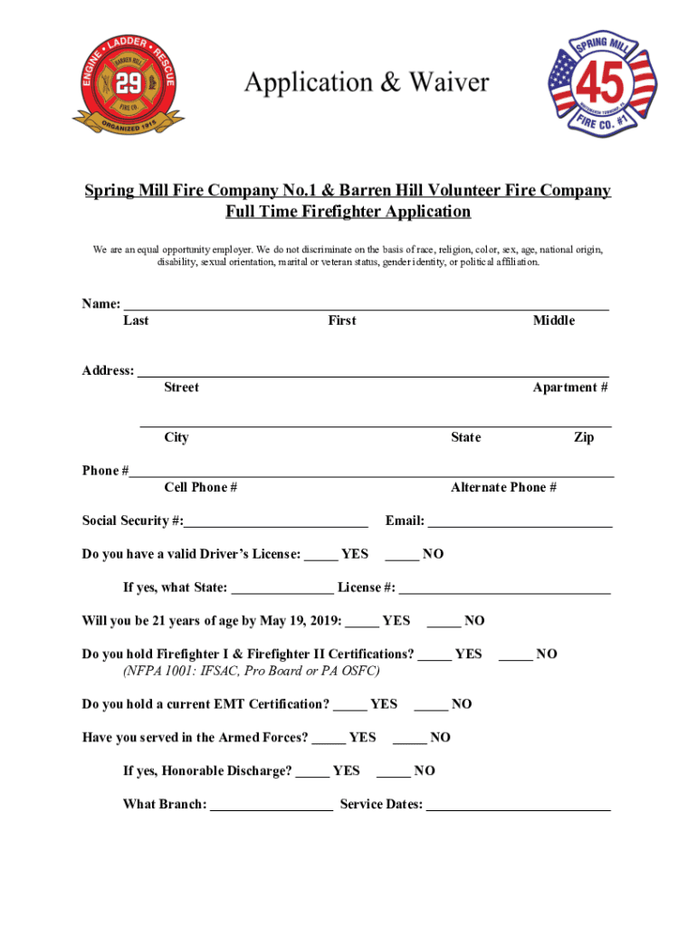 Spring Mill Fire Company No.1 & Barren Hill Volunteer Fire Company Full Time Firefighter Application We are an equal opportunity employer. We do not discriminate on the basis of race, religion, color,