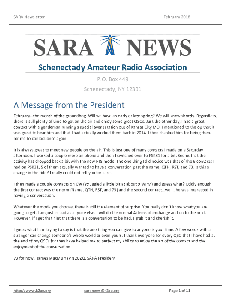 SARA Newsletter February 2018SARANEWSSchenectady Amateur Radio Association P.O. Box 449 Schenectady, NY 12301A Message from the President February the month of the groundhog. Will we have an early
