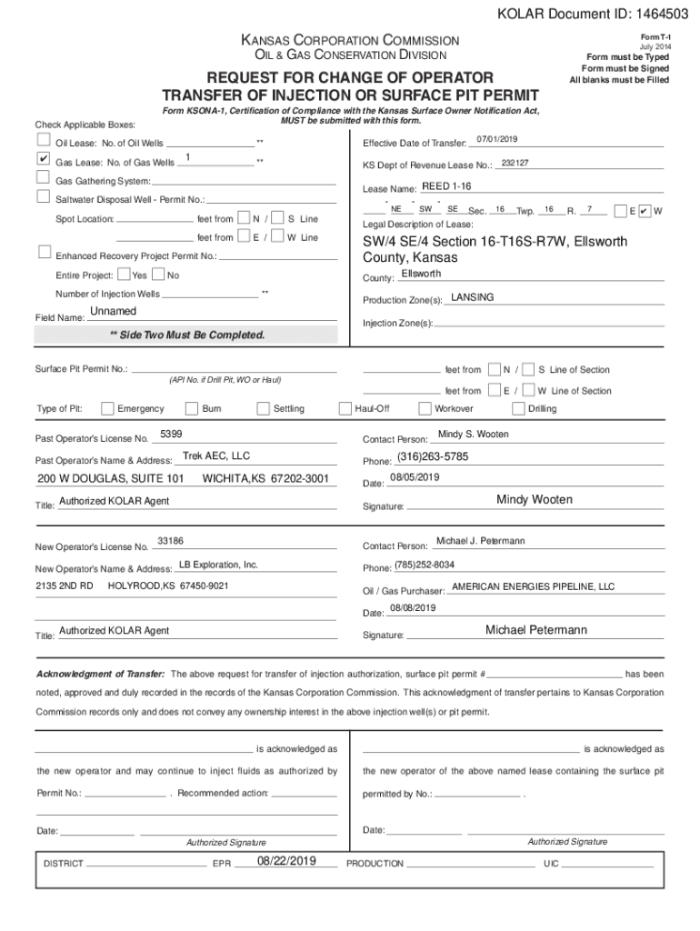 SOLAR Document ID: 1464503KANSAS CORPORATION Commissioner T1 July 2014OIL & GAS CONSERVATION DIVISIONForm must be Typed Form must be Signed All blanks must be FilledREQUEST FOR CHANGE OF OPERATOR