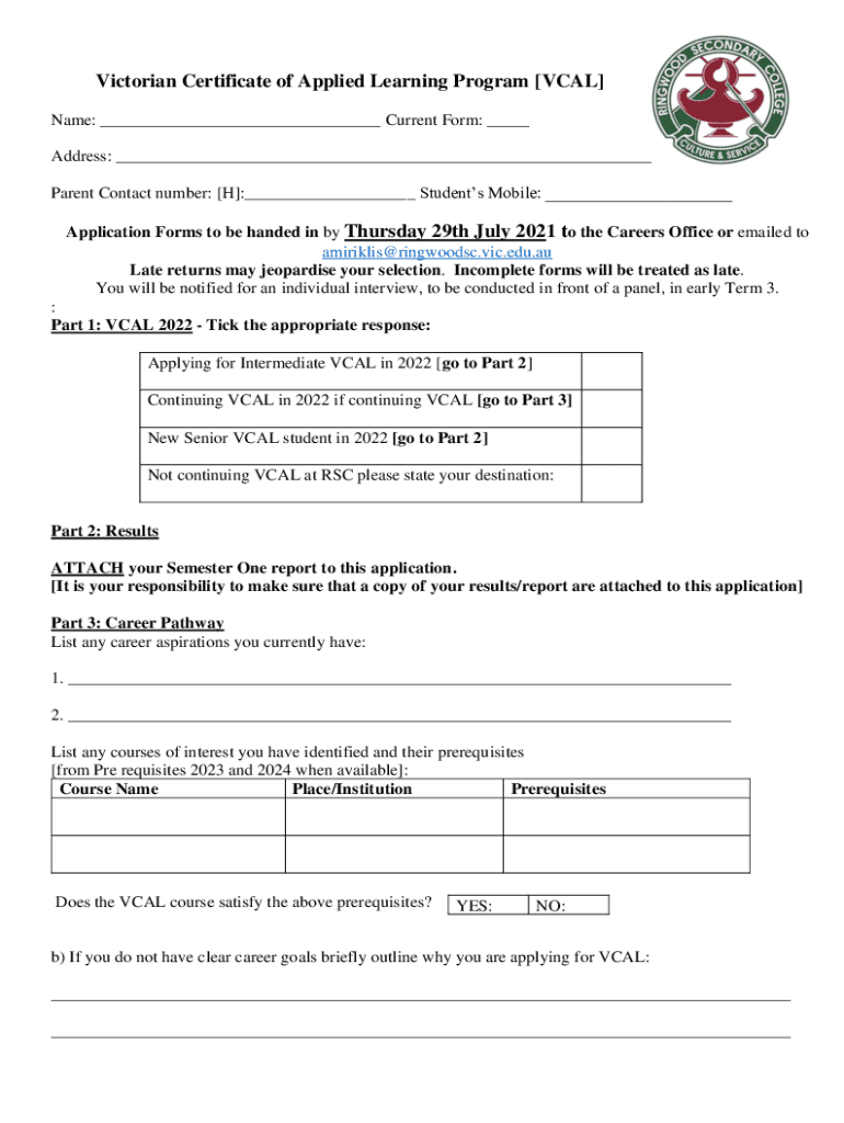Victorian Certificate of Applied Learning Program [VOCAL] Name: ___ Current Form: ___ Address: ___ Parent Contact number: [H]:___ Students Mobile: ___ Application Forms to be handed in by Thursday