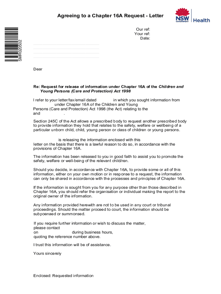 SMR020502SMR\”%\” 5Agreeing to a Chapter 16A Request Letter Our ref: Your ref: Date: ___ ___ ___ ___ Pierre: Request for release of information under Chapter 16A of the Children and Young Persons