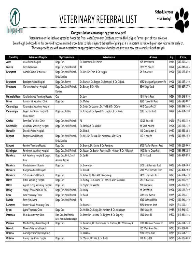 VETERINARY REFERRAL LISTSchedule your visit today! Congratulations on adopting your new pet! Veterinarians on this list have agreed to honor the Free Health Examination Certificate provided by Lollipop