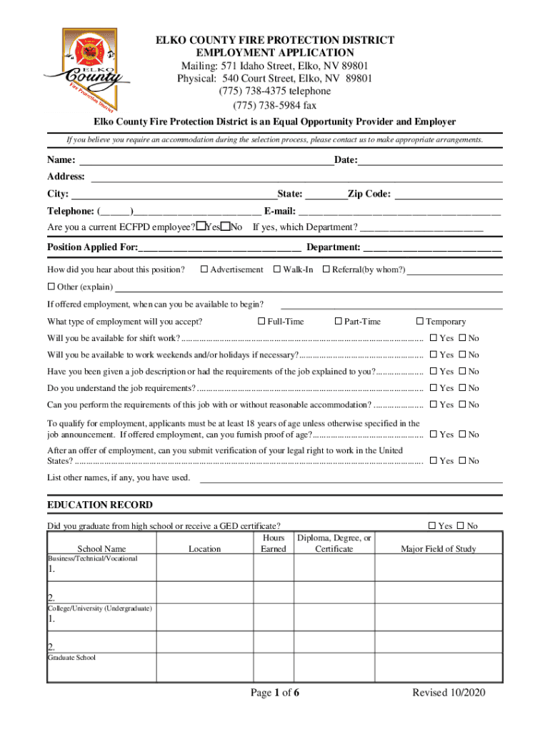 Get the free ELKO COUNTY EMPLOYMENT APPLICATION Mailing: 571 Idaho ...