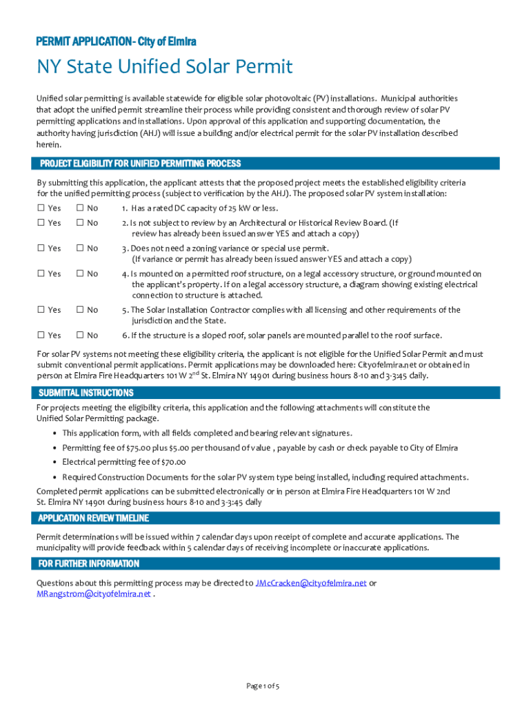 PERMIT APPLICATION City of Elmira NY State Unified Solar Permit Unified solar permitting is available statewide for eligible solar photovoltaic (PV) installations. Municipal authorities that adopt