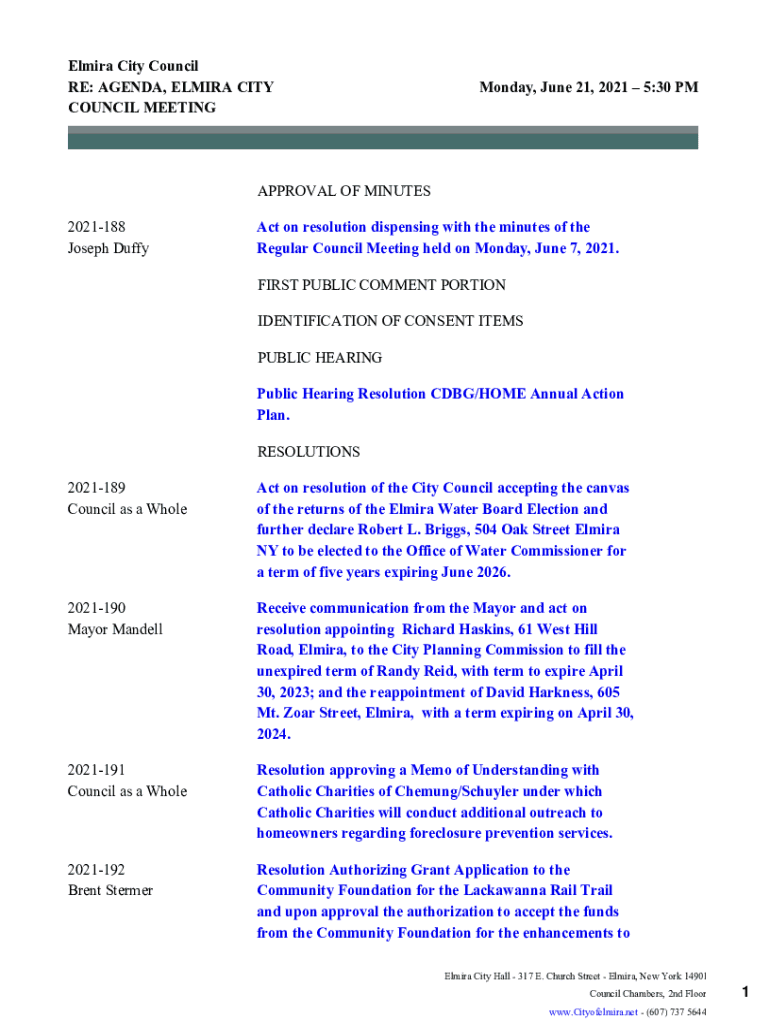 Elmira City Council RE: AGENDA, ELMIRA CITY COUNCIL MEETING Monday, June 21, 2021 5:30 APPROVAL OF MINUTES 2021188 Joseph Diffract on resolution dispensing with the minutes of the Regular Council