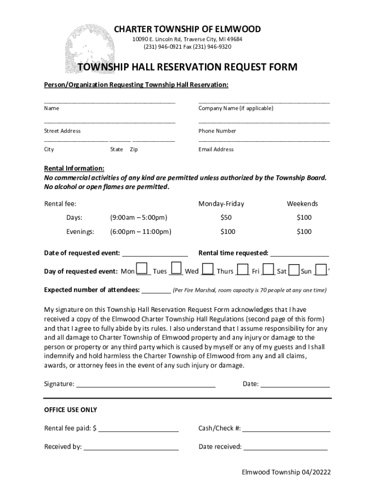 CHARTER TOWNSHIP OF ELMWOOD 10090 E. Lincoln Rd, Traverse City, MI 49684 (231) 9460921 Fax (231) 9469320TOWNSHIP HALL RESERVATION REQUEST FORM Person/Organization Requesting Township Hall Reservation: