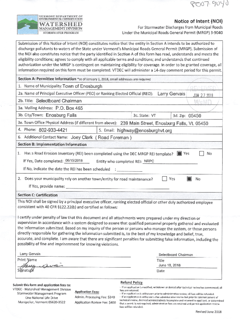 VERMONT DEPARTMENT OF Environmental/sea×notice of Intent(NO!) Watershed Stormwater Discharges from Municipal Roads Under the Municipal Roads General Permit(MRAP)39040MANAGEMENT DIVISION STORMWATER