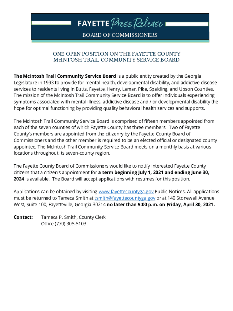 FAYETTE BOARD OF COMMISSIONERS ONE OPEN POSITION ON THE FAYETTE COUNTY McIntosh TRAIL COMMUNITY SERVICE BOARD The McIntosh Trail Community Service Board is a public entity created by the Georgia Legislature