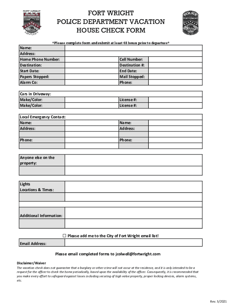 FORT WRIGHT POLICE DEPARTMENT VACATION HOUSE CHECK FORM *Please complete form and submit at least 48 hours prior to departure×Name: Address: Home Phone Number: Destination: Start Date: Papers Stopped: