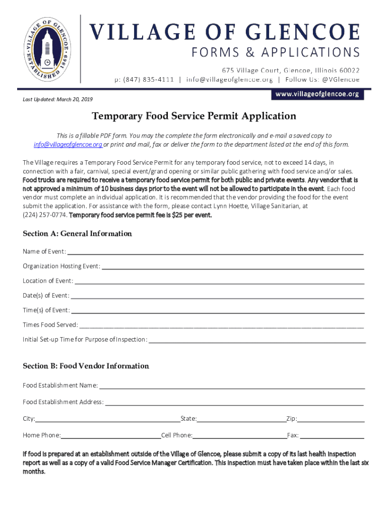 Last Updated: March 20, 2019Temporary Food Service Permit Application This is a fillable PDF form. You may to complete the form electronically and email a saved copy to info×villageofglencoe.org