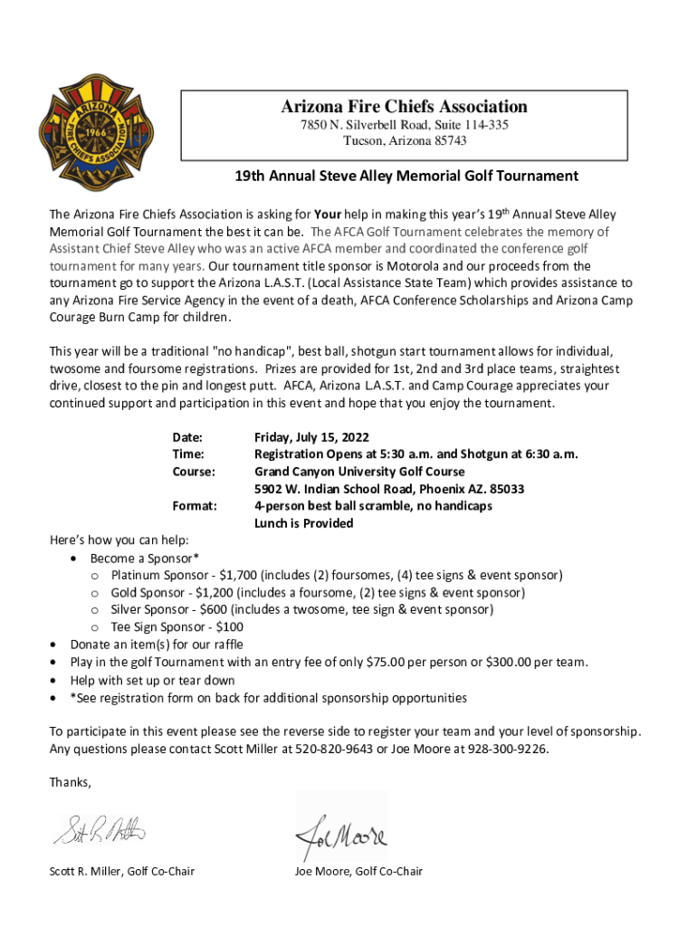 Arizona Fire Chiefs Association 7850 N. Silver bell Road, Suite 114335 Tucson, Arizona 8574319th Annual Steve Alley Memorial Golf Tournament The Arizona Fire Chiefs Association is asking for Your